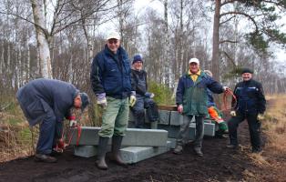 Nun also ein Moorlehrpfad, genauer: ein 3,8 Kilometer langer Rundweg inklusive eines Bohlenweges, dazu ein großer massiver Unterstand, 17 Erlebnisstationen und 23 Infotafeln. Alles selbst geplant und aufgebaut – ein gewaltiges Infrastrukturprojekt für ehrenamtliche Naturschützer.